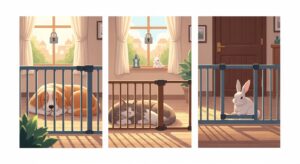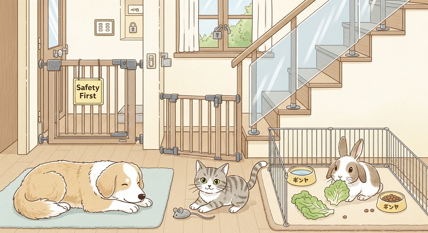 - 玄関: 飛び出し防止にペットゲートやフェンスを設置する。賃貸でも使える突っ張り棒タイプが便利です。