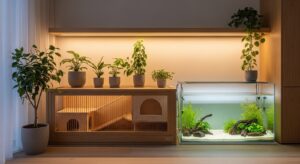 ケージや水槽周りに照明や観葉植物を加えるだけで、空間は見違えるほどおしゃれになります。