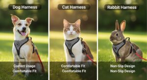 - ウサギ用ハーネス: 繊細な身体に負担をかけない設計。力が一点に集中しない、柔らかく軽量なベスト型が主流。