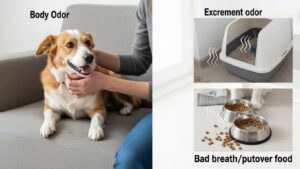 - ペットの匂いは、体臭、排泄物、口臭・腐敗臭が主な原因として考えられます。