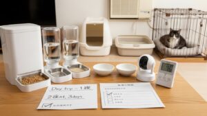 - 食事と水の確保:最も重要です。ドライフードなら自動給餌器を利用すると、決まった時間に適量のご飯をあげられて便利。水は、万が一こぼしても大丈夫なように、複数箇所に置いておくと安心です。