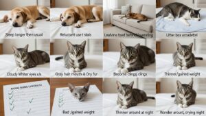 - 睡眠時間の増加、動きの鈍化、食欲やトイレの変化など、犬猫共通の老化サインが10項目あります。