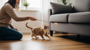 物陰に隠したり、急に止めたりと、予測不能な動きで興味を引きつけましょう。遊びの最後には必ず捕まえさせてあげることで、猫の満足感を満たし、ストレスを防ぎます。捕まえたらたくさん褒めて終わりにするのが理想です。