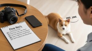 ペットの安全を守り、撮影を楽しい時間にするためには、まず飼い主自身が心に留めておくべき基本のルールがあります。以下の「5つのNO」を常に意識し、撮影を始める前の心構えとしましょう。