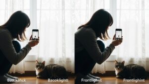 - 順光:ペットの正面から光が当たる状態。表情や色がはっきりと写ります。
