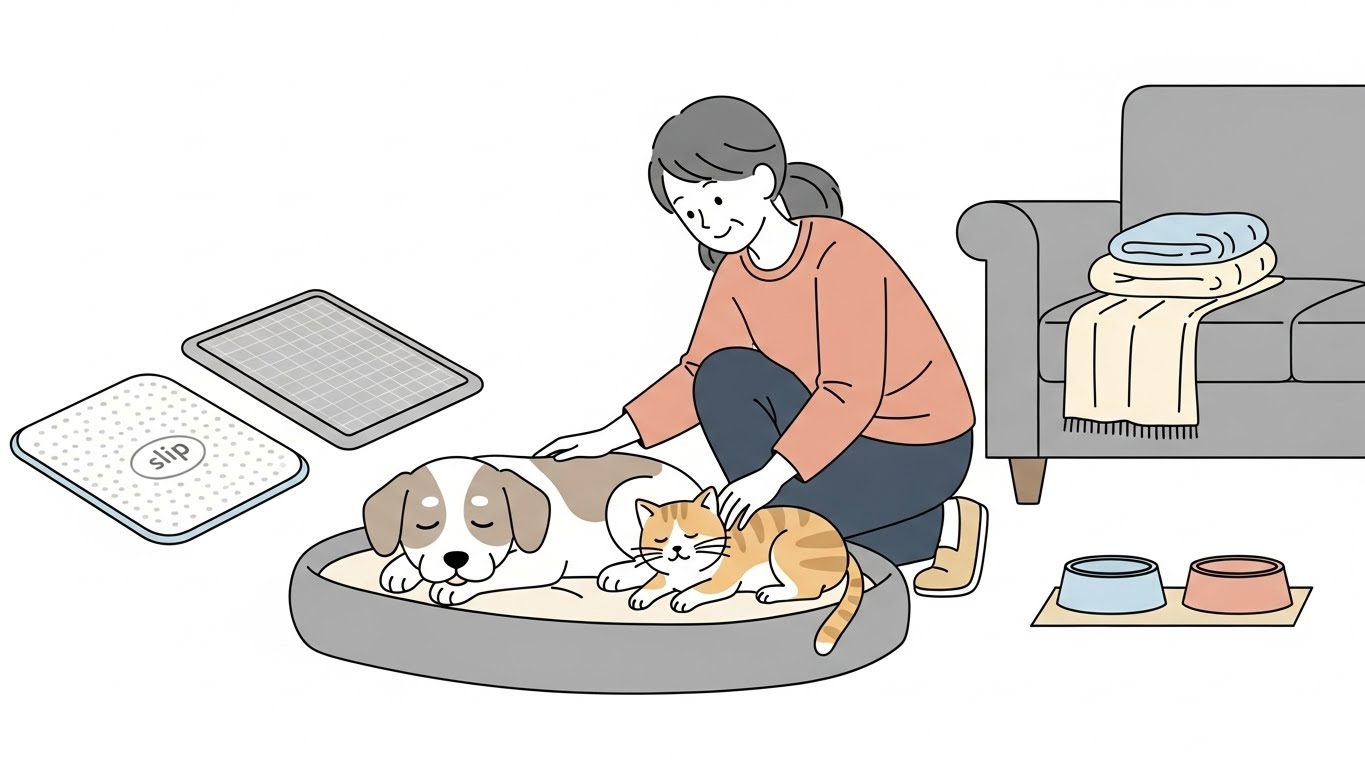 高齢のペットにとって、住み慣れた自宅も危険な場所になり得ます。筋力低下による転倒を防ぐため、フローリングには滑り止めのマットやカーペットを敷きましょう。