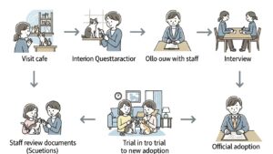 - 里親になるには、カフェでの観察、アンケート、面談、審査、トライアル期間を経て正式譲渡に至るプロセスがあります。