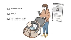 - 靴下の持参: 衛生管理のため、靴下の着用が義務付けられているカフェがほとんどです。