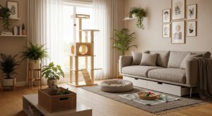 - 安心できる居場所作り: 部屋の隅など落ち着ける場所に、ペット専用のベッドやケージを設置。窓際にキャットタワーを置けば、猫の運動不足やストレス解消に繋がります。