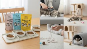 - フードの見直しと与え方の工夫 消化の良いフードや毛玉ケア用フードを選びましょう。一度に与える量を減らし、食事回数を1日3〜4回に分けると胃への負担が軽減されます。早食い防止食器の活用もおすすめです。