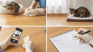 - 吐瀉物の確認と片付け 色や内容物を確認・撮影してから片付けます。その後、猫を静かな場所で休ませてあげましょう。