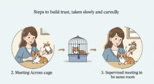 安全な室内環境が整ったら、次はいよいよお互いを慣れさせるステップに進みます。ここで最も大切なのは「焦らないこと」です。動物たちのペースを尊重し、時間をかけて慎重に進めることが成功の鍵です。