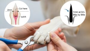 - 爪切りでは血管と神経「クイック」を傷つけないよう、白い爪は2mm手前、黒い爪は1mmずつ慎重に切ることが重要です。