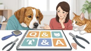 Q1: グルーミングはどのくらいの頻度で行うべきですか? A1: お手入れ内容とペットの種類によります。一般的に爪切りは月に1回、耳掃除は汚れが気になった時(垂れ耳犬種は週1回程度のチェック推奨)、ブラッシングは長毛種なら毎日、短毛種でも週に数回が理想です。ペットの状態をよく観察し、頻度を調整してください。