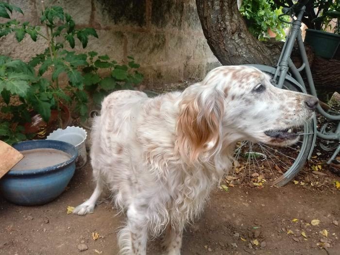 イングリッシュ・セッターは、白い色にオレンジや茶色のスポットがでていたり、個体差もありますが、斑が体全体を覆って、体もごま塩状態のカラーになっているのもいます。