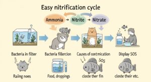 - 水質悪化を防ぐには、アンモニアから硝酸塩への「硝化サイクル」を理解し、定期的な水換えや水質検査、餌の与えすぎに注意が必要です。