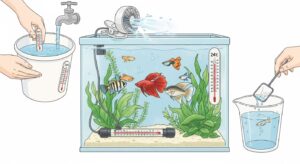 - 注意点:交換する水は必ずカルキ抜きを行い、水槽の水温に合わせてからゆっくり注ぎ入れる。