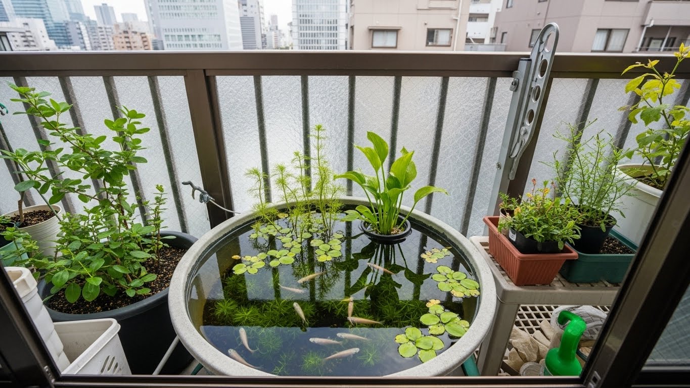 マンションのベランダビオトープの作り方|メダカと水草で始める小さな庭【初心者向け】
