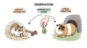 ハムスターは本来、地面に穴を掘って巣を作り、夜間に広範囲を移動します。一方、モルモットは臆病で、物陰に隠れることを好みます。ケージという限られた環境でも、トンネルや隠れ家、潜れる床材を用意することで、こうした本能的な欲求を満たし、精神的な安定につなげることができます。