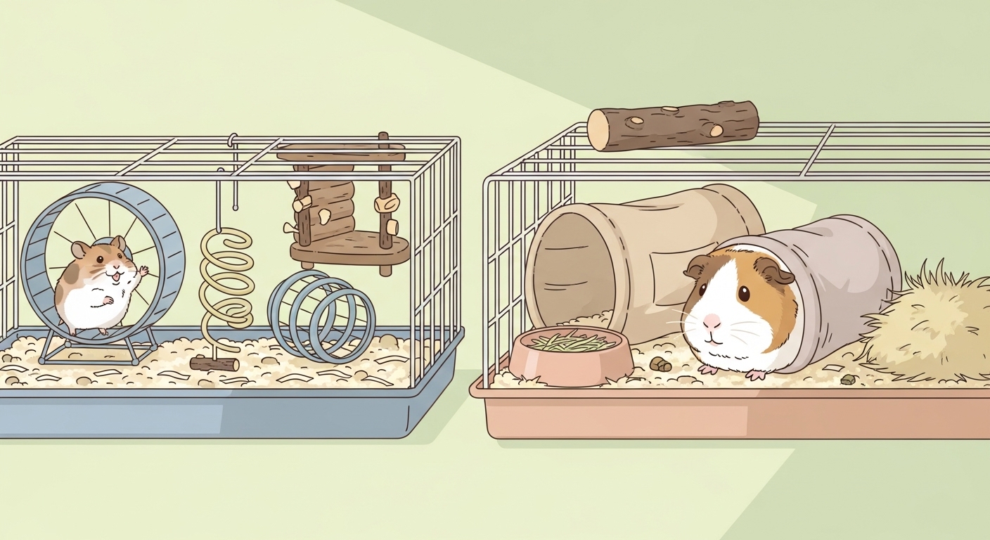 - ハムスターやモルモットの健康には、遊び道具と快適なケージレイアウトが不可欠です。